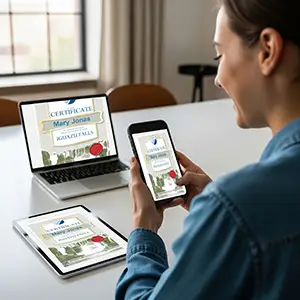 Receive your certificate instantly via email. Store it safely on all your devices, share it proudly on your social networks, or print it whenever you want. It's a memory that won't get lost or damaged.